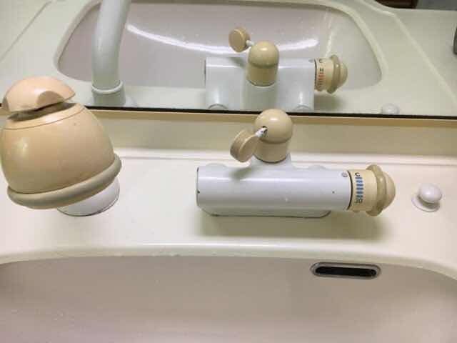 TOTO製の洗面台に付いているサーモスタット混合栓で、混合された水は左のシャワーヘッドから出ます。かなり古く、所々塗装が剥げています。