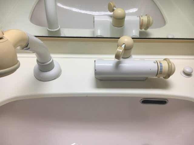 TOTO製の洗面台に付いているサーモスタット混合栓で、混合された水は左のシャワーヘッドから出ます。かなり古く、所々塗装が剥げています。
