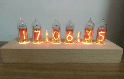 前回はリング状のWS2812B(NeoPixel)で点灯試験しましたが、今回は作った基板にLEDを載せています。ピンヘッダは秋月の丸ピンソケットに挿せるもの(少々高い)。左端が丸ピンソケットです。これをユニバーサル基板に実装し、ニキシー管基板は差し替えられるようにする構造。